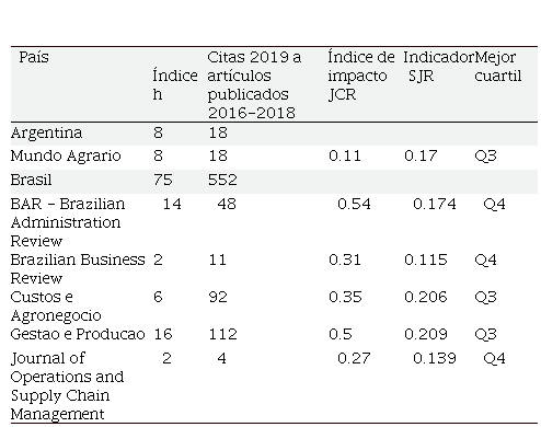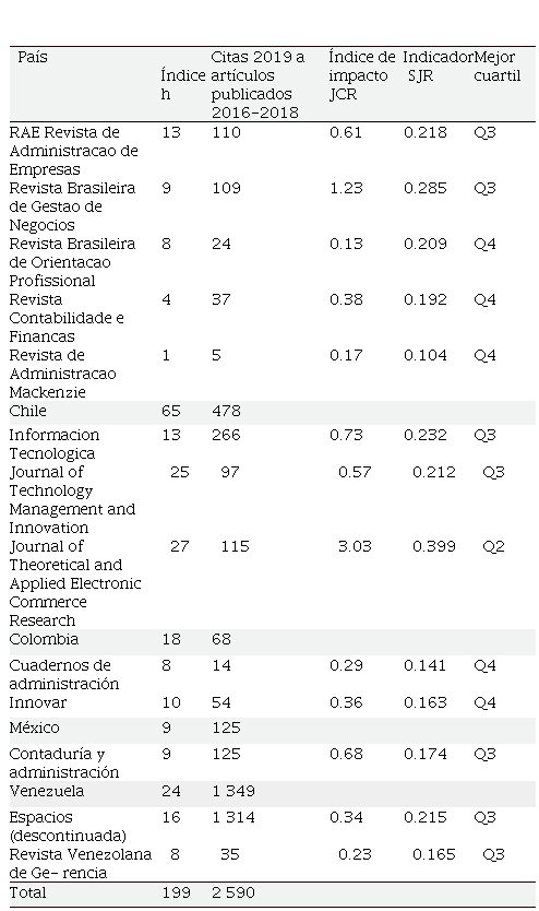 La Revista Brasileira de Gestao de Negocios, tuvo en 2019 un índice JCR de 1.23, lo que significa que durante el 2019 los artículos publicados en 2017 y 2018 tuvieron en promedio 1.23 citas por artículo; la revista chilena Informacion Tecnologica tuvo un índice JCR de 0.73; RAE Revista de Administracao de Empresas alcanzó un índice JCR de 0.61.