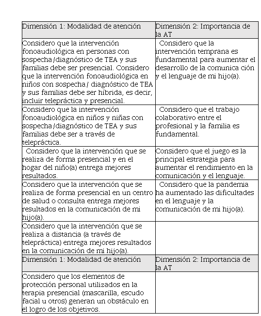 Para cumplir con el propósito, se planteó un estudio descriptivo transeccional no experimental cuyo fin es describir las apreciaciones de los padres y/o cuidadores sobre el impacto de la pandemia en la comunicación de niños con diagnóstico o sospecha de TEA, de edades entre 1 y 6 años, provenientes de Talca, Chile. Para ello, se diseñó una escala tipo Likert en formato digital, la cual contempló dos dimensiones para su posterior análisis: (1) apreciaciones sobre la atención fonoaudiológica durante la pandemia y (2) utilidad de la atención fonoaudiológica temprana. La validación interna de la encuesta se realizó a través del juicio de expertos, quienes eran fonoaudiólogos (. = 4) provenientes de países latinoamericanos que contaban con experiencia calificada en el ámbito investigativo y clínico. Los expertos evaluaron la escala de acuerdo a sus apreciaciones frente a cada pregunta, para luego ajustarla a su versión definitiva. La escala fue realizada en un formulario virtual y, ante cada consulta, las familias tenían cinco opciones de respuesta: “Muy de acuerdo”, “En acuerdo”, “Ni en acuerdo ni en desacuerdo”, “En desacuerdo” y “Muy en desacuerdo”. En la tabla 1 se adjuntan las dimensiones y preguntas que se les realizaron a los participantes de esta investigación.