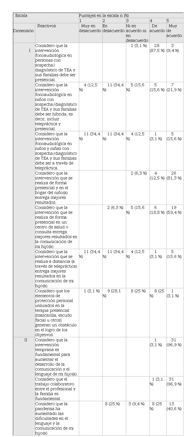 En cuanto a la modalidad de atención fonoaudiológica en contexto de pandemia, los padres y madres de niños con sospecha/diagnóstico de TEA mostraron un alto nivel de acuerdo (96,9%) en que la atención debería ser presencial, ya que entrega mejores resultados. Frente al reactivo relacionado con la atención de forma híbrida, es decir, que incluya telepráctica y atención presencial, las apreciaciones de los padres denotaron que el 38% se muestra en algún grado de acuerdo, sin embargo, los mayores porcentajes (62%) evidencian un grado de desacuerdo con dicha modalidad. Respecto al ítem que proponía que la forma de atención debería ser exclusivamente a través de telepráctica, las familias mostraron un alto nivel de desacuerdo (81,3%).