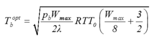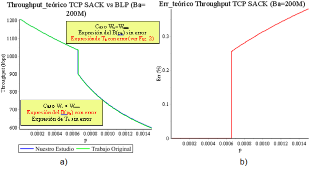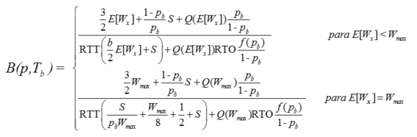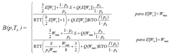 Para esquematizar un resumen en cuanto a las diferencias encontradas en las expresiones analíticas en los estudios previos de [1][2] con respecto al trabajo original realizado en [3], en la Fig. 1 se presenta un ejemplo del throughput de TCP SACK para una fuente con velocidad Ba = 200 Mbps considerando un Tb= 50ms para Wx<Wmax y un Tb=0.049 ms (con pb=0.001) para Wx=Wmax, que permite visualizar la región y variables involucradas: throughput de TCP B(pb, Tb) y el tiempo de ensamblado Tb.