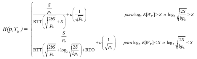 Se considera de manera independiente el caso de pérdidas por TD y el de pérdidas mixtas por TD y TO, además el análisis realizado por [3], y las redefiniciones explicadas en [5], se consigue la siguiente expresión general del throughput de TCP New Reno sobre redes OBS: