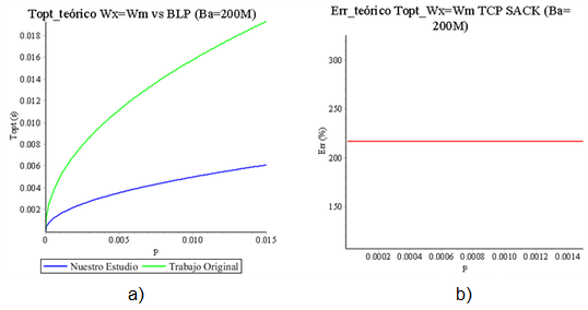 A diferencia del estudio previo realizado por [2], donde para el caso Wx=Wmax, se consideró únicamente el tiempo de ensamblado óptimo para una condición en particular (p=0.0001 y Ba=200 Mbps), este nuevo análisis mantiene la velocidad de la fuente TCP de Ba=200 Mbps pero cubre un espectro ampliado en cuanto a los tiempos de ensamblado con una ventana de +-10% con respecto a los valores óptimos basados en distintos niveles de pérdidas definidos, con valores muy bajos, que conducen al escenario donde las pérdidas de segmentos durante el ciclo de vida de una sesión TCP es mínimo, de manera que el throughput alcanza el máximo de la venta de transmisión de TCP. En este sentido, se expone a continuación la ecuación definida en cuanto al tiempo de ensamblado óptimo, que difiere significativamente de la expresión presentada en [3], como se pude apreciar en la Fig. 2; por lo que el error en la expresión original se puede deducir que es producto de una falla en cuanto a su desarrollo matemático: