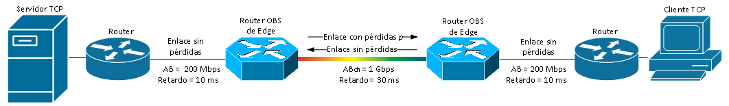 Con el objetivo de evaluar el desempeño de las implementaciones clásicas de TCP basadas en pérdidas, con relación a los modelos analíticos expuestos anteriormente, se ha definido un escenario compuesto por un único emisor y un receptor TCP, cada uno conectado a un nodo de edge en la red OBS a través de un enlace de acceso considerado sin pérdidas, complementado de un enlace DWDM que conecta dichos nodos OBS, caracterizado con una probabilidad de pérdida pb con distribución de tipo Bernoulli, sólo en el sentido del flujo de los datos y no en el opuesto asociado al envío de los reconocimientos (ACKs), es decir, desde el origen TCP (servidor) hacia el destino TCP (cliente), con el proceso de ensamblado de ráfagas en ambos routers de edge.