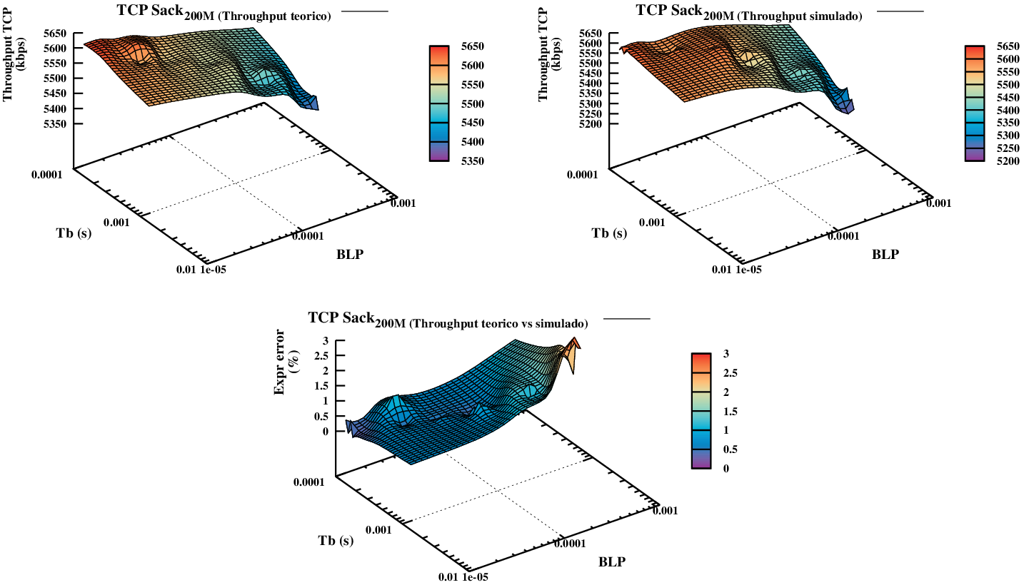 En comparación con el estudio anterior, se puede apreciar que para niveles de pérdidas bajos (< 1x10-4) el modelo analítico presenta un buen grado de aproximación en contraste con los datos obtenidos del ambiente de simulación, dado que la expresión analítica del throughput cae dentro del régimen de estado estacionario del ciclo de vida de un flujo TCP, donde el nivel de correlación es alto y en su mayor parte la ventana de TCP es igual a la ventana de transmisión máxima, y además que TCP se puede recuperar de las pérdidas aleatorias presentas, ya que no se llega al estado de inicio lento (slow start), donde se reinicia la transmisión. Las diferencias principales se evidencian para valores de mayor nivel de pérdida (> 0.0006) y se deben a que para una BLP (Burst Loss Probability) alta, el valor del tamaño de la ráfaga se reduce significativamente, conduciendo a que el valor de ecuación se encuentre entre los valores máximo y mínimo, debido a que la ventana de TCP se reinicia a la fase de inicio lento (slow start), la cual no se considera en este análisis, que está enfocado en el régimen de estado estacionario de TCP.