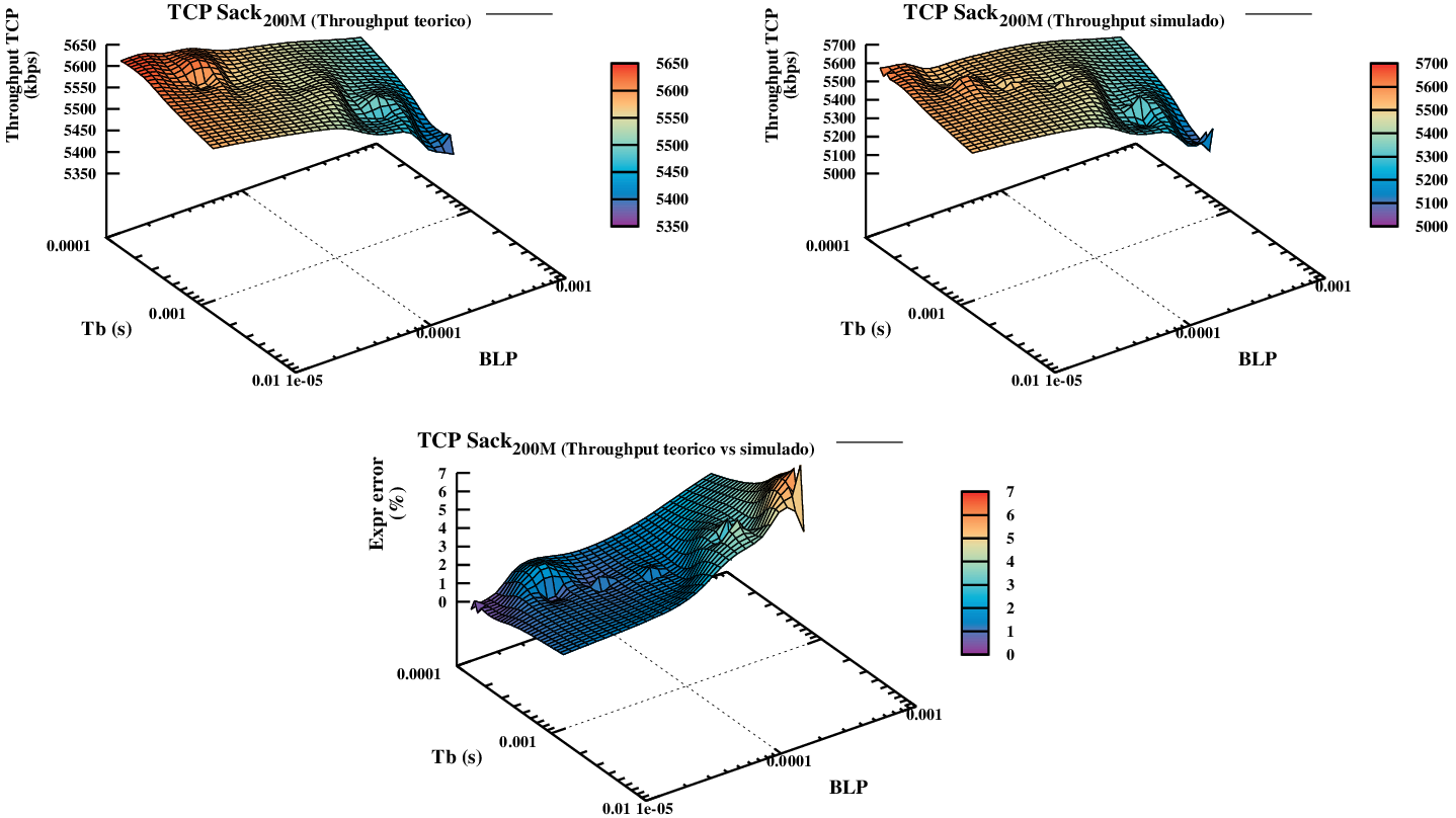 En cuanto al procesamiento de la información obtenida del simulador ns-2, se emplearon funciones en lenguaje awk para filtrar los datos y variables de interés, fijando el tiempo de ensamblado a través de los rangos seleccionados, conjuntamente con programación sobre la herramienta gnuplot para construir gráficos en 3D que muestran el throughput en función de la BLP (Burst Loss Probability) y el tiempo de ensamblado Tb.