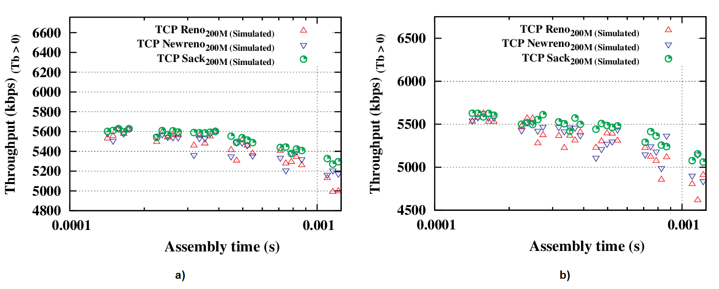 Este nuevo alcance se realiza con el fin de ampliar en la misma línea de investigación, el estudio del throughput de este protocolo para el caso particular de Wx = Wmax empleando rangos de tiempos de ensamblado de +-10% en referencia a sus valores óptimos para una fuente TCP con velocidad de acceso Ba = 200 Mbps y sus correspondientes niveles de pérdida, a diferencia del estudio previo realizado por [2] que contempló únicamente el tiempo de ensamblado óptimo con un único valor para (pb = 0.01 y Ba = 200 Mbps); esto teniendo en cuenta que de acuerdo a las expresiones matemáticas definidas en los estudios previos de [1][3], el tiempo de ensamblado óptimo no es constante para cualquier nivel de pérdida como el caso de Wx < Wmax, y sólo depende del tiempo de ida y vuelta sin ensambladores de ráfagas, RTT0, mientras que para el caso de Wx = Wmax el tiempo de ensamblado depende a más del RTT0, del nivel de pérdidas de ráfagas, pb, el ancho de banda de acceso, λ, y el tamaño máximo de la ventana de TCP, Wmax, por lo que se resulta ser más complejo; y es así que el hecho de esta nueva investigación, es justamente validar el impacto de la variación en los tiempos de ensamblado en torno a sus valores óptimos, con el fin de determinar si el mismo es importante o puede ser despreciable, puesto que en un ambiente real sería más complicado implementar una solución que ajuste el tiempo de ensamblado en base al nivel de pérdidas experimentado.