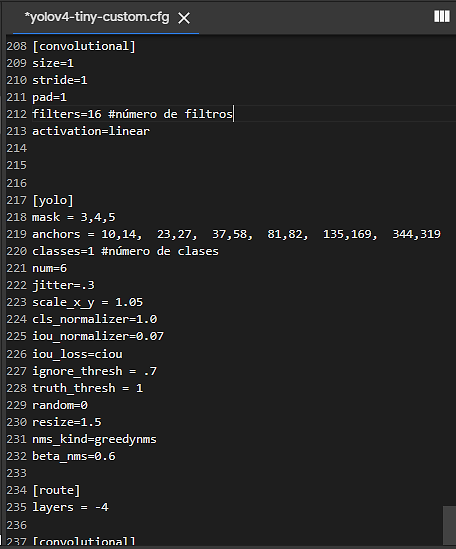 Además, se necesita de la integración del dataset que fue creado en Roboflow al entorno de entrenamiento. Igualmente, se requiere de la configuración de ciertos parámetros que son parte del entrenamiento del modelo yolov4-tiny como son: el número de épocas, el número de clases y la cantidad de filtros. La configuración de cada uno de los parámetros fue realizada desde el archivo yolov4-tiny-custom.cfg, como se indica en la Fig.10.