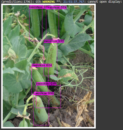 Finalmente, la red CNN yolov4-tiny fue entrenada para un total de 6000 épocas con ciertas variaciones, rotaciones y transformaciones que fueron recreadas por la librería OpenCV. De forma que, ofrezca variedad al entrenamiento y permita identificar las lesiones necróticas causadas por la plaga thrips en el guisante de manera rápida y precisa.