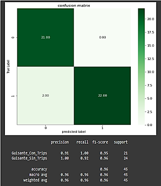 De acuerdo con los resultados entregados por la matriz de confusión, tiene un valor promedio de accuracy o precisión de 96%, lo que lo hace aceptable.