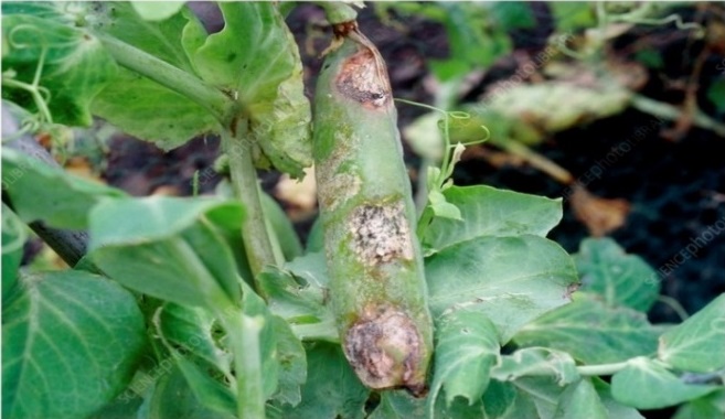 Guisante con lesiones necróticas causadas por la plaga thrips