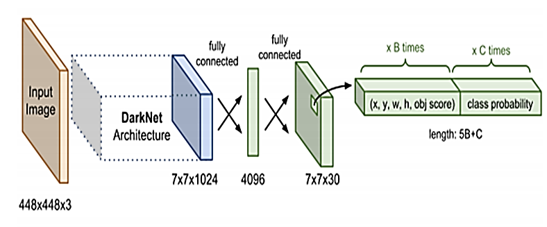 La arquitectura original del modelo Yolo, como se indica en la Fig.2, se basa en la CNN GoogleNet que se compone de 24 capas convolucionales. Las capas iniciales se encargan de extraer las características más significativas de la imagen, en cambio que las capas completamente conectadas predicen las probabilidades de la salida y las coordenadas de la ubicación del objeto de estudio [18].
