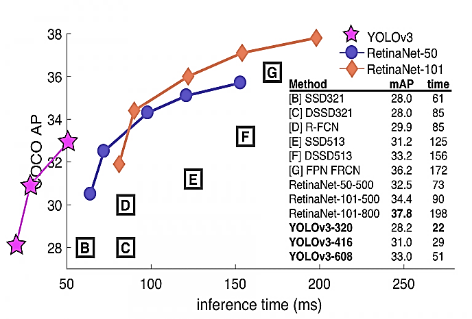 De esta manera, lo convierten en una arquitectura totalmente subyacente de 106 capas convolucionales, las que le han permitido posicionarse como uno de los modelos más rápidos y eficientes para la detección de objetos [18]. En la Fig.3, se observa el rendimiento de Yolov3 en comparación a otros modelos que son empleados para el mismo propósito.
