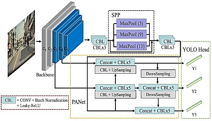 2. 2. El neck: la arquitectura Yolov4, emplea dos redes, la primera en la red de Agrupación de Pirámides Espaciales (SPP) que es utilizada para aumentar eficazmente la receptividad y ayudar a separar las características contextuales [19]. La segunda es la red de Agregación de Rutas (PANet), que permite acortar el camino que conecta la información de bajo y alto nivel, y los parámetros convergentes a diferentes niveles [19].