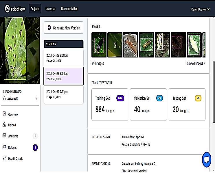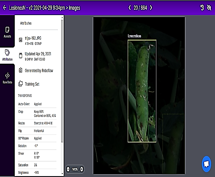 En esta fase, se trabaja directamente sobre las imágenes que fueron guardadas en formato JPG en un repositorio digital. Donde se identifican y etiquetan las características más significativas del objeto de estudio, mediante el uso de Roboflow. Este tipo de herramienta permitió aplicar atributos como: la orientación automática, redimensionamiento, rotación, saturación, brillo, exposición y difuminación. Con la finalidad de mejorar el reconocimiento de las lesiones necróticas en los cultivos como se muestra en la Fig.7.