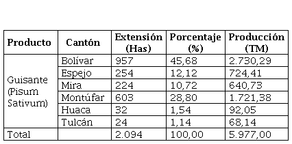 A nivel cantonal, Bolívar es el cantón que más produce guisante como se indica en la Tabla.1.