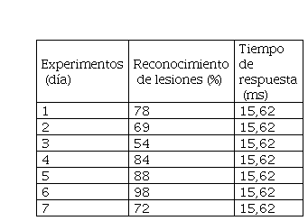 La Tabla II muestra los experimentos que fueron realizados en siete días. Donde se indica el promedio de la probabilidad que el modelo alcanza en el reconocimiento de lesiones necróticas y el tiempo de respuesta.