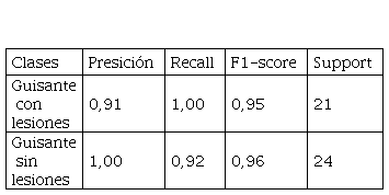 Adicionalmente, una investigación futura podría centrarse en la detección temprana de la plaga thrips en el guisante desde vehículos aéreos no tripulados, debido a que, la plaga thrips en el guisante se presenta en cualquier etapa y así poder sugerir un plan de prevención basada en el nivel de la enfermedad que tenga el cultivo.
