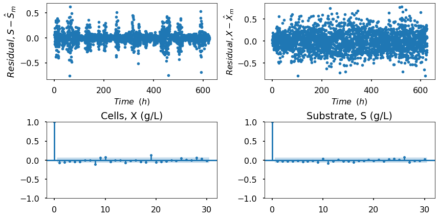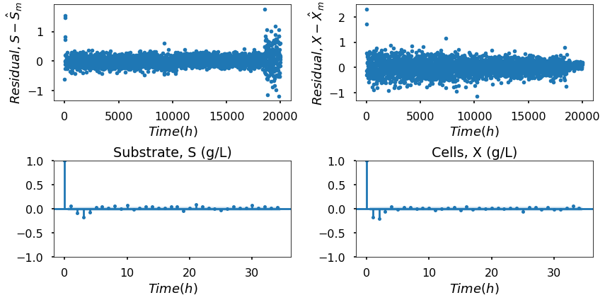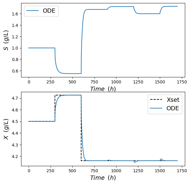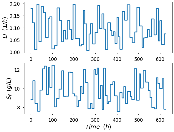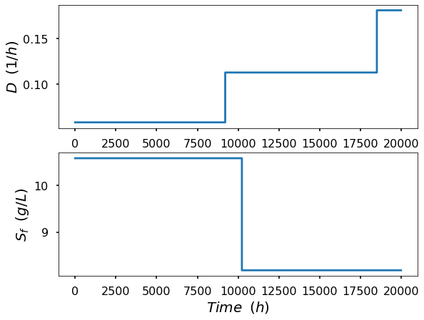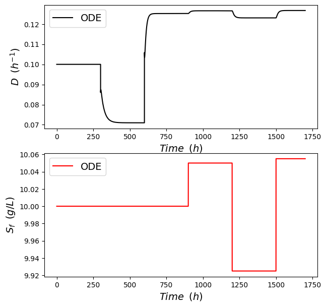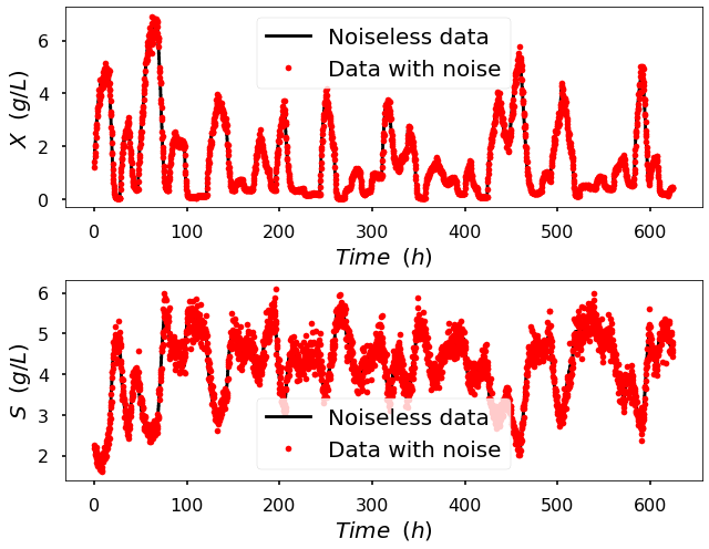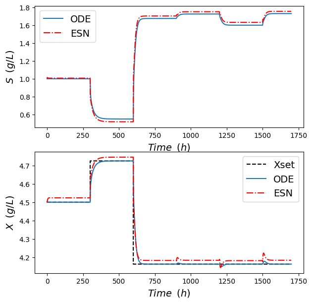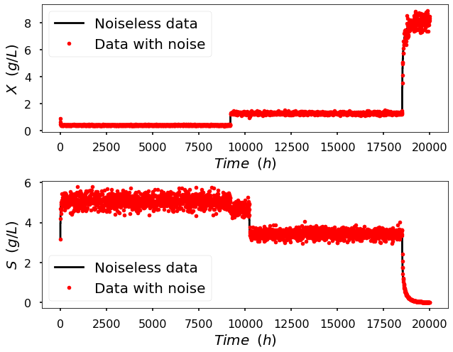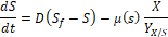The mathematical model employed to generate the data was adapted from [17], outlining the dynamic behavior of a bioreactor. The equations that govern substrate balance, S, and cell balance, 𝑋, are expressed by (2) and (3), respectively, while the reaction rate, 𝜇(𝑆), is defined by (4), where 𝐷 is defined as the dilution rate, that represents the ratio between the volumetric feed flow rate and the reactor volume, and Sfstands for the substrate feed concentration.