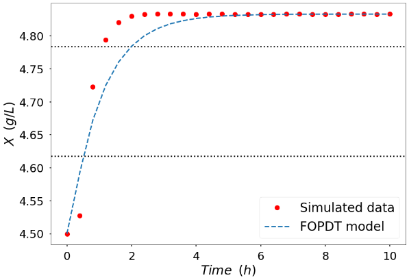 A transfer function of the reactor dynamics was obtained to tune the controller, with a step test of -5% on D, performed on the differential model from its initial conditions. The steady-state response obtained was Xs = 4.5 g L⁻¹ and Ss = 1.0 g L⁻¹. With the approach of [19], it was possible to approximate the process with a first-order plus dead time (FOPDT) system. Fig. 5 comparatively illustrates the original process (differential model), represented by red points, and the approximated process. The parameters obtained through such an approach are shown in Table II.