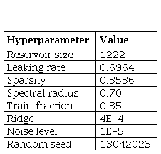 In this implementation, the ESN network algorithm was coded following the equations outlined by [8], with specific hyperparameters maintained at fixed values (Table I). These predetermined values were determined empirically. An optimization method was utilized and implemented through Python programming to identify the optimal hyperparameters - neuron count, sparsity, and leaking rate. Following this, the resulting network was validated using the fine-tuned hyperparameters.
