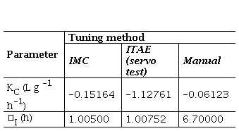After conducting tests on different controllers, three tuning techniques were applied: Internal Model Control (IMC), Integral of Time multiplied by Absolute Error for servo test (ITAE), and manual fine-tuning [17]. The parameters for each tuning technique are described in Table III. It was concluded that the manually tuned controller was the best choice for this study, even though it was a more conservative option. The manually tuned controller yielded a favorable result of less oscillation in the manipulated variable during closed-loop tests. Additionally, it demonstrated a slight difference in response time compared to the other controllers examined. The gain margin of the manually fine-tuned controller was 56.8437, which is significantly higher than the gain margins of the IMC (22.9541) and ITAE-servo test (3.0869) methods. This result suggests that the manually fine-tuned controller is more robust than the other methods. As a result, the manually fine-tuned controller was chosen due to its quick, highly stable, and oscillation-free response.