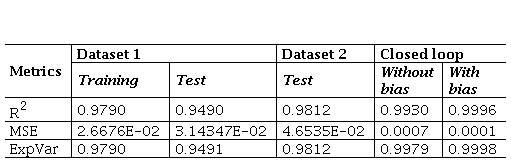 Detailed performance metrics for the training, testing, and closed-loop application phases are provided in Table IV. The findings demonstrate the exceptional predictive capabilities of the network, which achieves outstanding performance in forecasting output data despite being trained on a comparatively small dataset — and contrasts with the higher training percentages commonly used in the literature. Notably, the network accurately captured the output dynamics in the first dataset with remarkable precision. Furthermore, the successful modeling of a scenario with lower variability in the second dataset suggests its versatility and robustness. Thus, inferring that the acquired meta-model fits both scenarios is reasonable. Moreover, the closed-loop results showcase the neural network potential as a virtual representation that reflects real-time process responses, thereby mimicking real-world scenarios with fidelity.