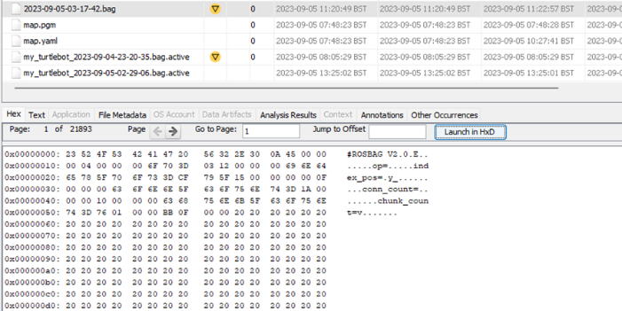 An analysis using the Autopsy tool was conducted to examine the structure and contents of a ROS Bag file extracted from the virtual disk (.vmdk). The .vmdk image was loaded into Autopsy and FTK Imager for forensics analysis and verification. The findings from this analysis revealed crucial information about the internal organization and metadata of this file. The analysis primarily focused on hexadecimal lines extracted from the file which contained critical details regarding the file's structure and metadata (see Figure 5).