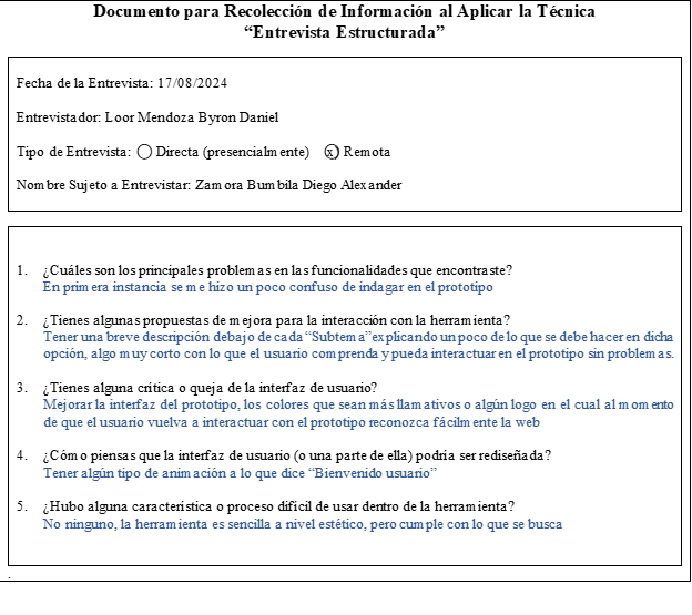 Paso 6: Análisis de datos y consolidación de resultados. Las respuestas obtenidas fueron sistematizadas y agrupadas temáticamente para eliminar redundancias. Posteriormente, se documentaron en un informe de entrevista estructurada que sirvió como base para identificar áreas de mejora del prototipo.