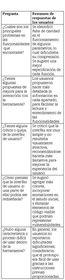 Con el objetivo de validar la experiencia del usuario y detectar oportunidades de mejora en el prototipo desarrollado con el fin de identificar fallas de seguridad en sistemas web, se propuso la realización de una evaluación de usabilidad basada en la técnica entrevista estructurada.
