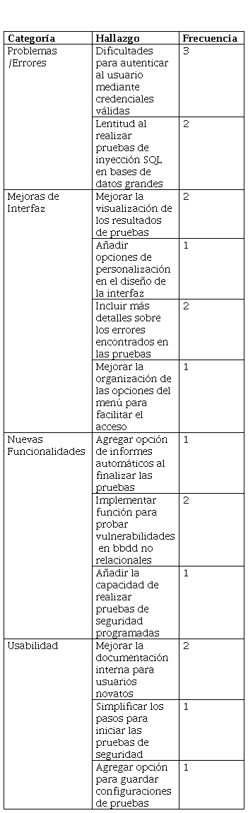 El análisis de las observaciones y sugerencias emitidas por los usuarios entrevistados proporciona una visión integral de las áreas del prototipo SecureSQLTester que requieren atención y mejora. Esta retroalimentación es fundamental para orientar las futuras iteraciones de desarrollo, lo cual permite priorizar cambios basados en las necesidades reales y percepciones de los usuarios finales. La Tabla X incluye una síntesis de los hallazgos más relevantes, clasificados por categoría, tipo de observación y frecuencia de aparición entre los participantes.