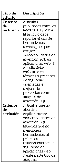 Durante este proceso de revisión de literatura, se identificaron diferencias importantes entre una diversidad de herramientas empleadas para mitigar vulnerabilidades de inyección SQL, entre las cuales se distinguen soluciones de código abierto y herramientas propietarias. Por ejemplo, SQLMap es una herramienta de código abierto ampliamente utilizada por su facilidad de acceso, flexibilidad y ausencia de costo de licencia. En contraste, herramientas como QualysGuard y Nessus son plataformas comerciales, con mayores requisitos técnicos y económicos, lo que restringe su adopción en contextos con limitaciones presupuestarias o técnicos. Esta diferenciación fue considerada al momento de evaluar la aplicabilidad de las soluciones revisadas en función del público objetivo del presente estudio [6] .