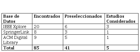 En la Tabla II, se sintetiza la cantidad de estudios encontrados, seleccionados y considerados, como resultado de la aplicación del conjunto de términos de búsqueda en diversas fuentes bibliográficas digitales.