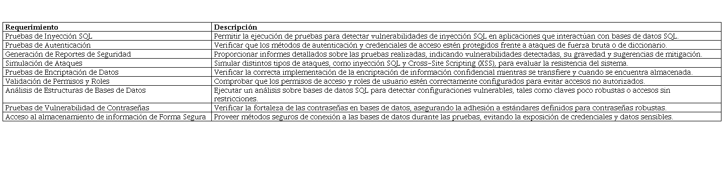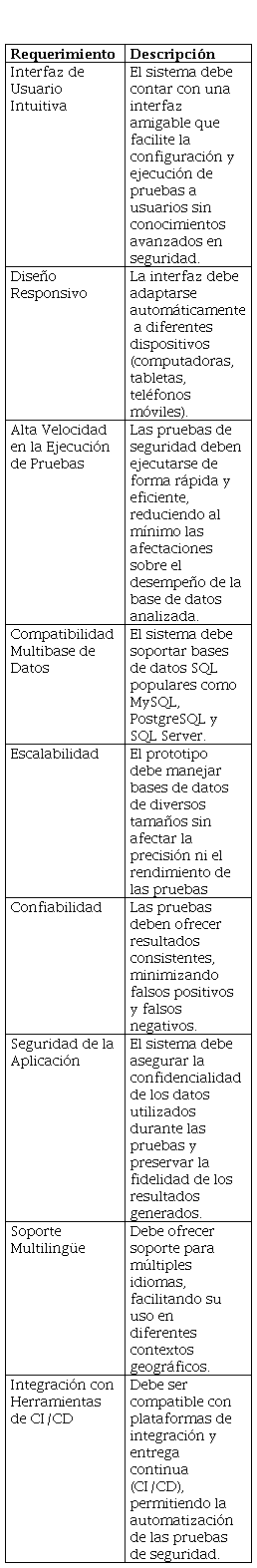 b) Documentación de Requisitos: En la Tabla III, se presentan los requisitos funcionales, los cuales describen las capacidades específicas que debe ofrecer el sistema para cumplir con su propósito de detección y mitigación de vulnerabilidades de inyección SQL. Por su parte, la Tabla IV muestra los requisitos no funcionales, orientados a definir las características de calidad que aseguren el desempeño, la seguridad y la usabilidad del prototipo.