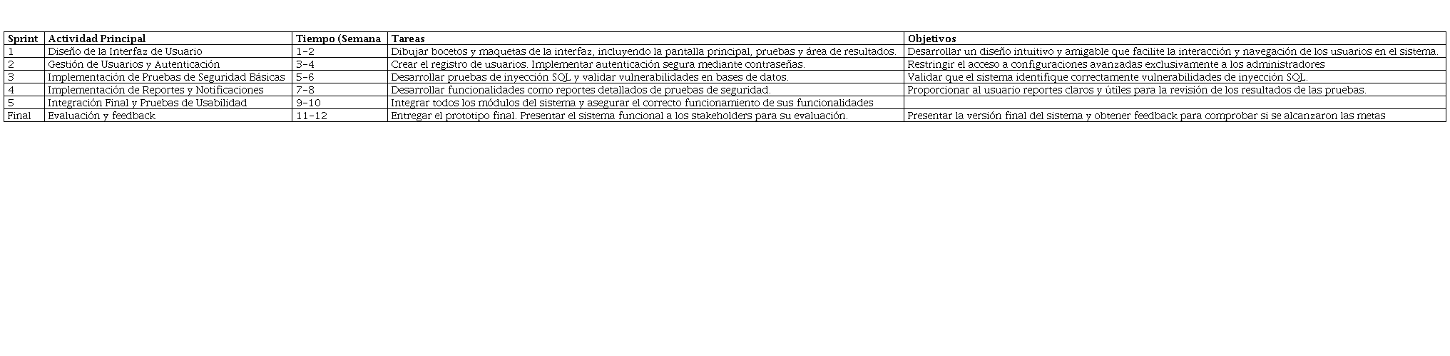 El desarrollo del proyecto se organizó siguiendo los principios de la metodología ágil Scrum, que permite gestionar proyectos complejos mediante entregas iterativas y la priorización continua de tareas. Inicialmente, se elaboró un Product Backlog que recopiló todas las funcionalidades y actividades necesarias para la construcción del prototipo SecureSQLTester. Cada ítem del backlog fue priorizado de acuerdo con su importancia, con el fin de alcanzar las metas definidas en la propuesta. Posteriormente, se estableció una planificación basada en sprints de dos semanas de duración. Al inicio de cada sprint, se seleccionaron las tareas de mayor prioridad, y se establecieron metas claras y alcanzables para garantizar avances consistentes y enfocados. Esta estrategia permitió una adaptación ágil a los requerimientos emergentes y facilitó la entrega incremental de valor a lo largo del proyecto En la Tabla V, se incluye un detalle completo de los sprints llevados a cabo, junto con las principales tareas realizadas y los objetivos definidos en cada etapa.