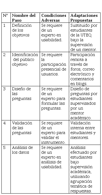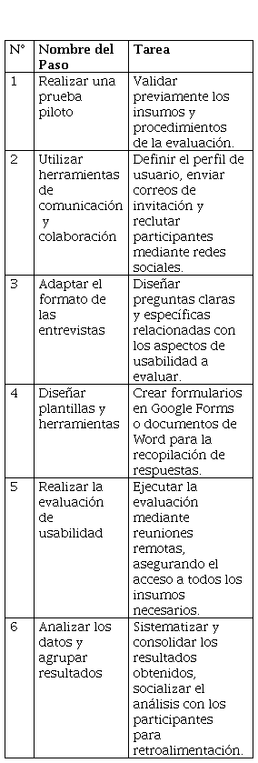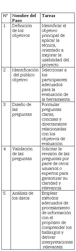 La técnica aplicada en este estudio siguió el procedimiento clásico propuesto por Hix y Hartson [16], el cual contempla cinco pasos esenciales, que se detallan en la Tabla VI.