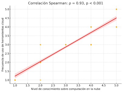 To further explore this trend, a correlation analysis was conducted between the level of knowledge about cloud computing and the frequency of tool usage. This analysis was based on the codified survey responses, reflecting the reported proportions: 27% of participants indicated being fully familiar with cloud computing, while 30% stated they use these tools frequently.