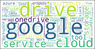 In Fig. 2, the word cloud generated from the open-ended responses of survey participants illustrates the cloud tools and services they consider relevant or would like to implement or improve in their institution. Terms such as Google, Drive, OneDrive, Microsoft, and service stand out, indicating a strong preference for well-known storage platforms and services. Additionally, frequent mentions of words like tool, cloud, collaboration, platform, AWS, and Azure reflect interest in technological solutions that facilitate academic and administrative work.