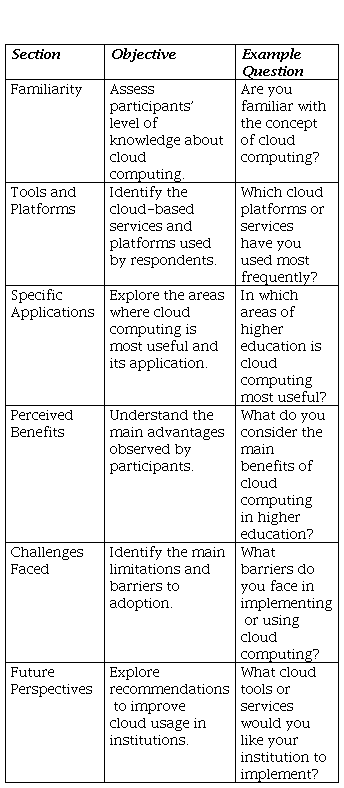 The questionnaire consisted of 15 questions—14 closed (single or multiple choice) and one open-ended question—to gather additional opinions and suggestions. The questions were organized into six thematic sections to address various aspects of cloud computing in higher education.