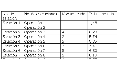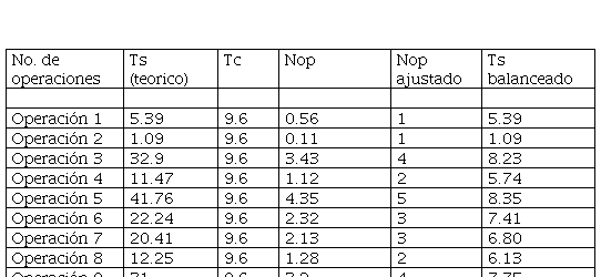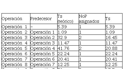 Al inicio del estudio, la línea de producción estaba conformada por 9 operaciones secuenciales, con 12 trabajadores empleados (NoP asignados). El número de trabaja-dores asignados a cada operación no era uniforme. Se procedió a recuperar la información sobre el tiempo estándar de cada operación de trabajo (Ts(teórico)) y el tiempo estándar alcanzado con la configuración de la línea de la empresa (Ts). Esta información se presenta en la tabla 1.