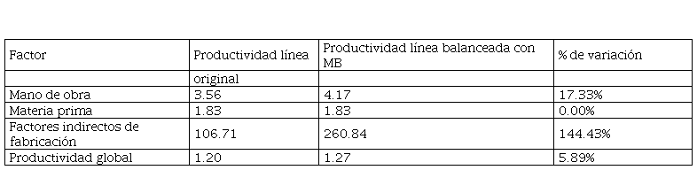 Tasa de variación de la productividad con el MB de balanceo de carga de trabajo: El balanceo de cargas de trabajo, utilizando el MB, tuvo una repercusión positiva tanto en la productividad global, como por factor de producción de la línea de confección, por lo que la tasa de variación de productividad experimentó valores positivos. El impacto en la productividad global se mide en 5,89%, mientras que el de los factores llega ser 17,33% en el caso de mano de obra y 144,43% para los factores indirectos de la producción. Esto se presenta en la tabla 5.