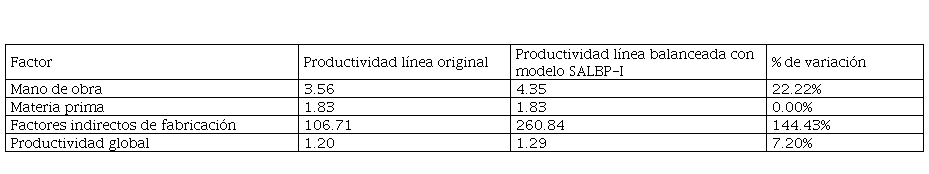 Enseguida se calcula la variación de la productividad global y de los factores de producción resultantes del balanceo de las cargas de trabajo realizadas con el modelo SALB-I.