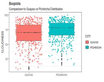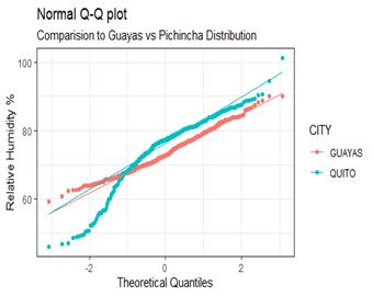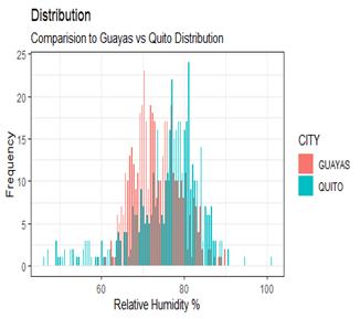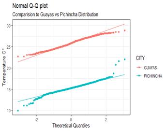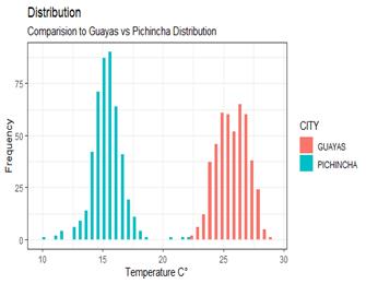 Figure 1 shows that in Guayas, temperatures are between 22 and 30 degrees Celsius, unlike Pichincha, which has temperatures below 20 degrees Celsius. Pichincha has a higher frequency of temperatures between 15 and 16 degrees Celsius.