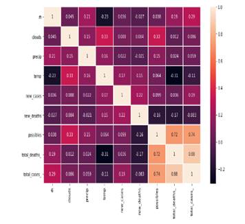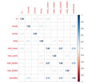 It used powerful tools to model data, applying the deaths and the weather factors such as relative humidity, number of clouds on that day, temperature, and total deaths. It allows us to notice the correlation in the result, but remember that this experiment uses the total cases as a prediction feature(Prata, Rodrigues, & Bermejo, 2020).