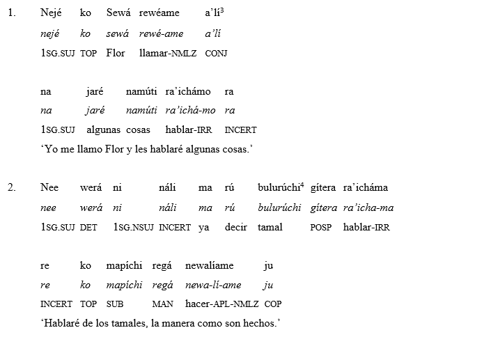 El material expuesto en este trabajo pertenece a la variante central del tarahumara, específicamente de la zona de Rochéachi. La colaboración se realizó con Flor Esther Morales Moreno una hablante nativa y oriunda de la región. Flor Esther Morales Moreno es licenciada en lingüística antropológica por la Escuela de Antropología e Historia del Norte de México (EAHNM). Ha sido acreedora del Premio Erasmo Palma al mérito literario 2017 con su obra titulada Kíne u’súwala a’lí Chiwáwa, (Las pláticas de mi abuela Elena: de Basoréachi a Chihuahua).