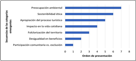 A través del análisis de las narrativas de las veinte entrevistas y de la convivencia directa con la comunidad, se siguió un proceso de codificación temática. Primero, se procedió con la codificación abierta, revisando cada fragmento de conversación de las entrevistas para extraer palabras y frases clave como «sentirse excluido», «ganancias desiguales», «actuar para el turista», «falta de consulta» o «cuidar el lago». A partir de allí, se procedió a la agrupación y codificación axial, agrupando aquellas ideas afines en categorías más amplias (por ejemplo, «participación», «sentirse excluido», «falta de consulta», entre otros). Finalmente, se dejó de crear nuevas categorías cuando se comprobó que los temas ya habían aparecido varias veces, garantizando que cada tema emergente estuviera realmente presente en las voces de los entrevistados. En consecuencia, se identificaron siete categorías emergentes, que se presentan en el mismo orden en que aparecieron, tal como se observa en la Figura 1.