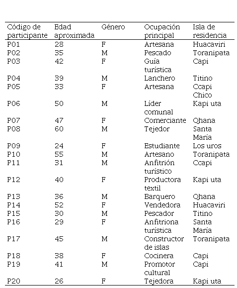Para recoger la información, se combinaron dos herramientas fundamentales: entrevistas estructuradas y observación participante, durante cuatro semanas entre los meses de junio y julio de 2024. Se entrevistaron al azar a veinte personas adultas (hombres y mujeres) residentes en distintas islas de los Uros, se procuró diversidad generacional, ocupacional y de experiencias turísticas, y se tomó en cuenta la disponibilidad, la voluntad de participar y la relevancia de su experiencia. Asimismo, se aplicó el criterio de saturación teórica, es decir, se detuvo la recolección cuando los relatos comenzaron a repetirse en temas clave.