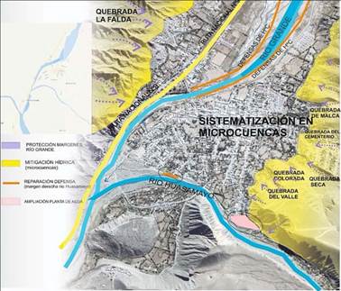 En segundo lugar, los emplazamientos urbanos se localizan en áreas de depósito o con riesgo de desprendimientos de material. El caso más paradigmático es la localidad de Tilcara, donde más del 70 % de la trama urbana se sitúa en zonas con elevado riesgo, debido a los flujos de sedimentos que pueden transportarse durante la época de lluvias en verano. En la Figura 2 se puede identificar el plan de mitigación hídrica ejecutado parcialmente. Por lo tanto, se trata de una localidad con poca tierra disponible, cercada por dos ríos, montañas y quebradas. Asimismo, los terrenos con «mejores rentas» (diferenciales) han sido adquiridos; mientras que los ubicados en áreas periféricas se emplazan en sitios con peligro de inundación y transporte de material, o bien con riesgo de deslizamiento hacia los faldeos de los cerros. Por último, el nivel de accesibilidad a través de caminos en condiciones no es el mejor, a la vez que algunos lotes no cuentan con servicios básicos ni se encuentran regularizados.