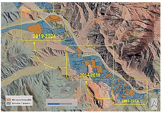 Para el caso de Maimará, alrededor del 40 % de la superficie de la serie se ofertó entre 2004 y 2015, mientras que el 60 % se negoció entre 2016 y 2024. Esta diferencia se apoyó en la falta de espacio en la vecina Tilcara, dado que, ante la escasez de tierras, las inmobiliarias comenzaron a ofrecer terrenos a menos de diez kilómetros al sur de la principal localidad turística de la región y a precios más accesibles.