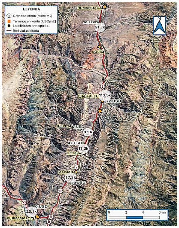 En la Figura 5 se puede identificar el stock de tierras resultante de grandes propiedades durante los últimos seis años, localizado principalmente entre Huacalera (49 %) y Humahuaca (23 %). Esto se traduce en precios a la baja, tanto por cantidad como por distancia con las principales centralidades. No obstante, se presenta como una posibilidad para el desarrollo del turismo rural y –en especial– del enológico. Por su parte, Purmamarca registra el 11 % gracias a la expansión hacia Chalala. Finalmente, Tilcara representa apenas el 5 %, mientras que sus «satélites» Maimará y Juella alcanzan el 8 % y el 4 %, respectivamente.