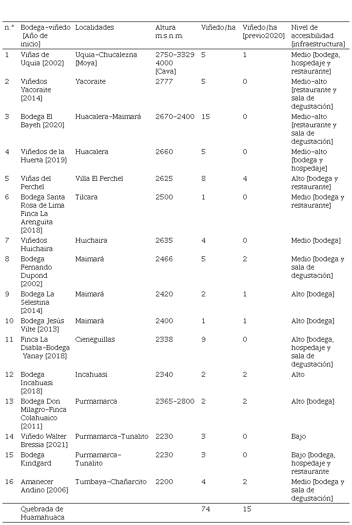 En la Tabla 3 se pueden observar todas las bodegas y viñedos existentes en la Quebrada de Humahuaca de acuerdo con su año de inicio, localización, accesibilidad e infraestructura turística. Asimismo, se identifica el crecimiento después del año 2020, pasando de apenas 15 hectáreas a 74 en la actualidad. Es necesario aclarar que varias bodegas existían de manera previa, pero no poseían superficie implantada (ya que solo adquirían uva y la vinificaban). A partir de ciertas ventajas en el ciclo económico y las facilidades crediticias, se logró un avance semejante, multiplicando por cinco el área vitivinícola en cinco años. Pero más importante aún, gran parte de los viñedos se favoreció por la compra de tierras a bajo precio, en varios casos fiscales. Y, dichas parcelas, pese a no contar con canales de riego, obtención del recurso hídrico a través de perforaciones se vieron beneficiadas con energía barata para la con bombas de extracción (Braticevic, 2022).